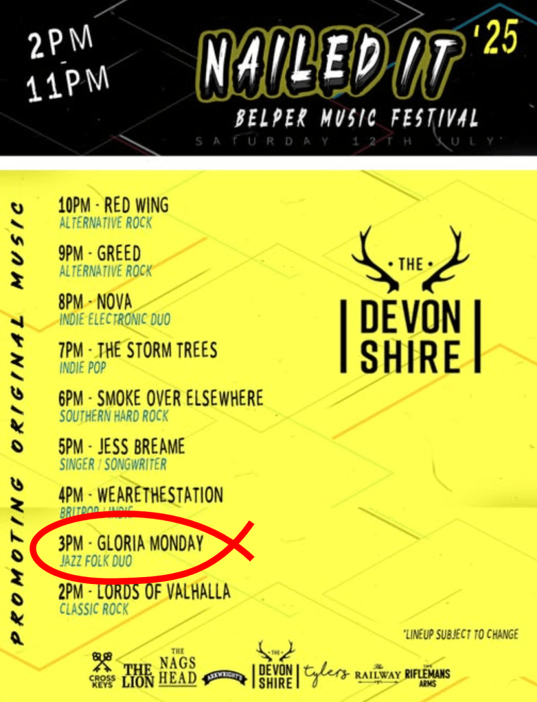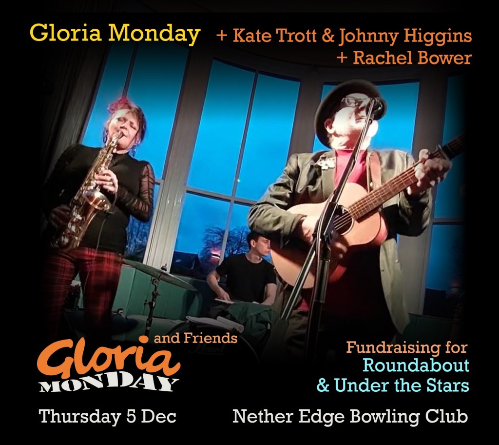 It’s December so it’s Gloria Monday at the top of the bill. It’s nearly a year since we took on a new name and a new direction, we have some new songs of our own, with an upbeat celebratory feel, new arrangements of old favourites and more saxophone!